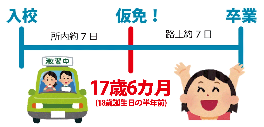 ◎つまり、合宿免許は17歳6カ月(誕生日半年前)のおよそ1週間前が最速。