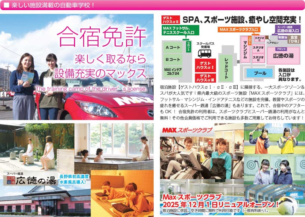 私たちは、楽しく合宿できる環境をご用意。長野県下最大級のスポーツクラブ「MAXスポーツクラブ」やスーパー銭湯「 広徳の湯」が宿泊施設に隣接。教習生はスーパー銭湯・ジム・プールを全て毎日無料でご利用いただけます。